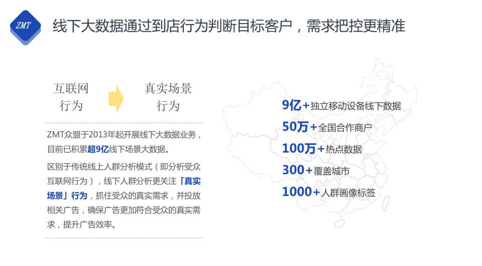 基于9亿 + 线下场景大数据的一站式展示类广告营销服务及工业化投放平台,洞察用户真实需求,打通线下+线上数据,分析广告受众到店数据,向精准人群高效展示广告,打造完整营销闭环。